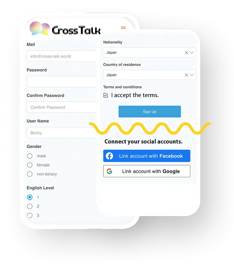 The only random video chat service where you can talk with peace of mind Sign Up Sign In CrossTalkの利用シーン Use case ideas ケース① 外国語学習 マッチしたユーザーとの共通言語を使ってコミュニケーション を取ることによって言語を使いこなせるようになりましょう。 他にも、新しい言葉や、若者言葉を学ぶ機会にもなります。 ケース② 旅行先の情報収集 旅行に行きたい国のユーザーを選択して、現地の状況やおススメの情報収集をしましょう。ガイドブックにも載っていないローカルなお店や、絶景スポットにも出会えるかもしれません。 ケース③ 国際交流 国内だけでなく、国外に住む友人が増えるチャンスにもなります。新しい友人が出来ることで、新しい自分に気づくかも?? ケース④ 異文化交流を通した情報交換 文化が違う友人と様々な情報交換をすることで、世界のことをもっと身近に感じられるかもしれません。世界との境界線はとっくになくなっています。 CrossTalkの特徴 Features You can start for free ! Smooth conversations, every time. You can choose English level and gender Get started for free! Sign Up Sign In CrossTalkの使い方 How to use 使い方は簡単。ビデオ接続するまでのステップをご紹介します。 STEP❶ 登録SNS認証をして、ユーザー名やパスワード、国籍や居住国のほか、性別と英語レベルを選択してアカウント作成して下さい。 STEP❷ マッチング接続相手の性別と英語レベルを選択して、connectボタンを押すとすぐにマッチング!合計6分間ビデオ通話が開始されます。 STEP❸ 通話と評価話題に困ったときは話題ボックスを押してくれれば話題を提案します!通話終了後は評価をして下さい。問題があれば通報して下さい。 CrossTalkの安心・安全な理由 safety support 安心・安全にご利用いただけるように、様々な仕組みに取り組んでいます。 安心のSNS認証 Cross Talkではアカウント作成時にFACEBOOK認証やGoogleでの認証を導入することで 悪質なユーザーやBANユーザーへの対処を徹底しています。 評価機能と通報機能 悪質なユーザーがいたら評価か通報でお知らせください!自動システムとスタッフの目視によって悪質なユーザーとのマッチングをなくしたり、場合によっては警告や凍結、BANも行います。 ユーザー情報は完全非公開・匿名OK 登録時にSNS認証しますが、利用については本名や個人情報は不要です!プライバシーをしっかり守ります。 あなたのプライバシー、国際基準で守ります Cross Talkは、EUのGDPR(一般データ保護規則)に準拠し、あなたの個人情報を丁寧に取り扱います。個人情報は暗号化して安全に管理した上で、利用者の同意なしに情報を第三者に提供することはありません。 会話のその後も、しっかり守る 会話が終わった後も安心してもらいたい。CROSS TALKでは、録画・スクショの示唆や、SNSでの晒し・追跡行為は禁止です。違反があれば厳正に対処。あなたのプライバシーは、しっかり守ります。 ちゃんとつながる、ちゃんと話せる 無言だったり、カメラが真っ暗だったり…。そんな「?」な体験は、CROSS TALKでは減らしていきます。しっかり話して、しっかり出会う。それがCROSS TALKのスタンダードです。 You can connect in English right now. Sign Up Sign In Active User 0 K+ Total User 0 K+ COUNTRY 0 + good reviews 0 K+ CrossTalkよくある質問 CrossTalkのお知らせ Get started for free! Sign Up Sign In